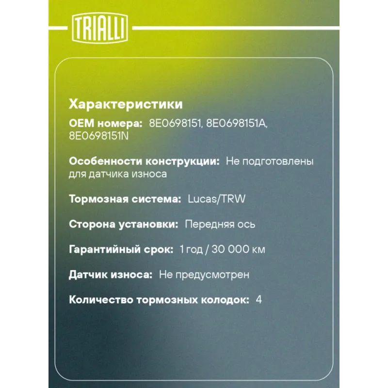 | Особенности конструкции: | Не подготовлены для датчика износа |