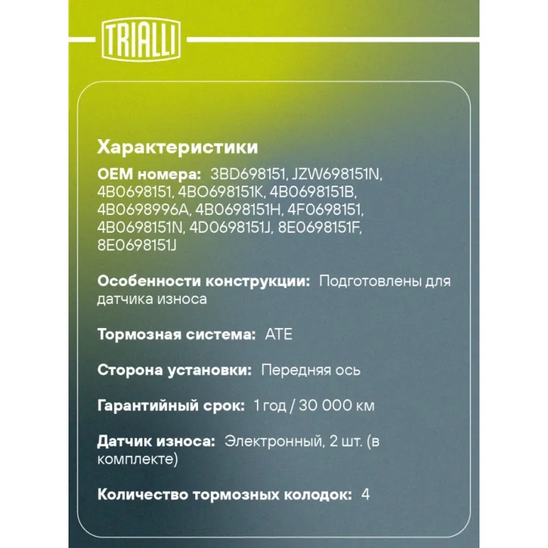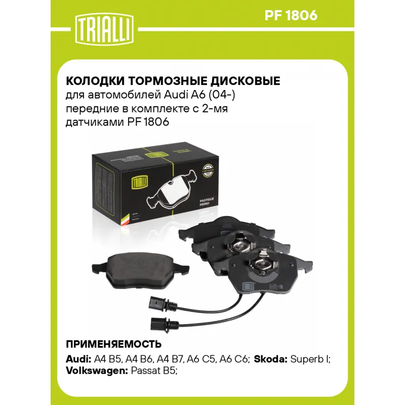 Колодки тормозные дисковые для автомобилей Audi A6 (04-) передние в комплекте с 2-мя датчиками Характеристики: Артикул: PF 1806 OEM номера: 3BD698151, JZW698151N, 4B0698151, 4BO698151K, 8E0698151F, 4B0698151M, 4B0698151N, 4D0698151J, 4D0698151J, 8E0698151F, 8E0698151J, 8E0698151K, 4B0698151AF, 4B0698151E, 4B0698151J, 4B0698151K, 4B0698151M, 4B0698151N, 4B0698151K, 4B0698151H, 4B0698151AB, 4B0698151E, 4F0698151, 4B0698151AB, 8E0698151K, 4B0698151B, 4B0698151J, 8E0698151J, 4B0698151AF, 4B0698996A, L4B0698151J, L4BD698151, L4F0698151 Количество на автомобиль: 1 Сторона установки: передняя ось Особенности конструкции:: Подготовлены для датчика износа Тормозная система: ATE Гарантийный срок: 1 год / 30 000 км Датчик износа: Электронный, 2 шт. (в комплекте) Количество тормозных колодок: 4 Сопутствующий товар: Диски тормозные: DF 165112 Ширина, мм: 156,4 Высота, мм: 74,2 Толщина, мм: 19,5 Материал фрикционной накладки: Low-Metallic Сопутствующий товар: Шланги тормозные: BF 4811 Сопутствующий товар: Суппорты тормозные: CF 182007; CF 182008; CF 182069; CF 182070; CF 182557; CF 182558; CF 550112 Подходит для авто: Audi A4 B5 (94-), A4 B6 (00-), A4 B7 (04-), A4 B7 (04-), A6 C5 (97-), A6 C6 (04-) Skoda Superb I (01-) Volkswagen Passat B5 (96-), Passat B5 (96-) Для проверки применяемости отправьте VIN автомобиля через вкладку "Есть вопросы о товаре?" Комплектация: Колодка тормозная - 4 шт Датчик износа - 2 шт Гарантия: от 1 года.