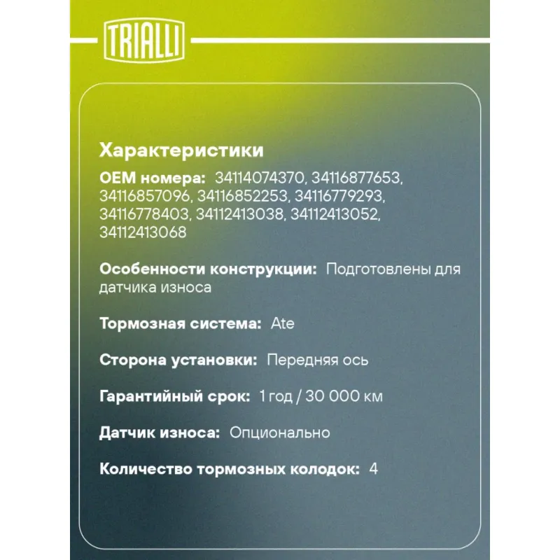 | Гарантийный срок | 1 год / 30 000 км |