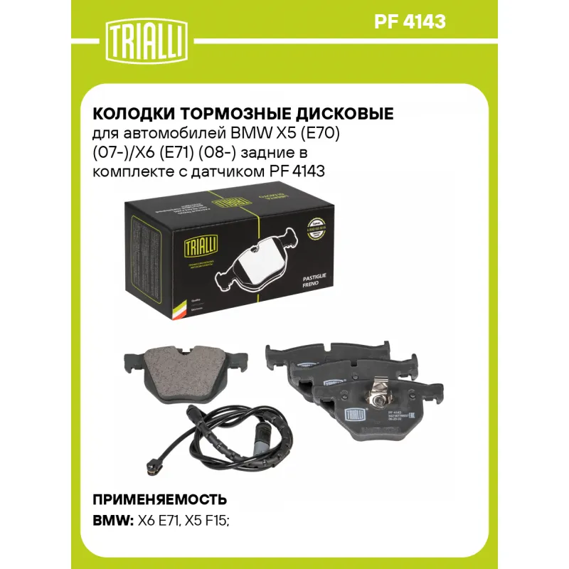 Колодки тормозные дисковые для автомобилей BMW X5 (E70) (07-)/X6 (E71) (08-) задние в комплекте с датчиком Характеристики: Артикул: PF 4143 OEM номера: 34216776937, 34212413041, 34212413040, 34216857108, 34216868497 Количество на автомобиль: 1 Сторона установки: Задняя ось Особенности конструкции:: Подготовлены для датчика износа WVA: 23447, 23732 Тормозная система: Ate Гарантийный срок: 1 год / 30 000 км Датчик износа: Электронный, 1 шт. (в комплекте) Количество тормозных колодок: 4 Сопутствующий товар: Диски тормозные: DF 261504 Ширина 1, мм: 122 Ширина 2, мм: 123 Высота 1, мм: 58 Высота 2, мм: 59 Толщина, мм: 17 Материал фрикционной накладки: Low-Metallic Подходит для авто: BMW X6 E71 (08-), X5 F15 (13-) Для проверки применяемости отправьте VIN автомобиля через вкладку "Есть вопросы о товаре?" Комплектация: Датчик износа - 1 шт Колодка тормозная - 4 шт Гарантия: от 1 года.