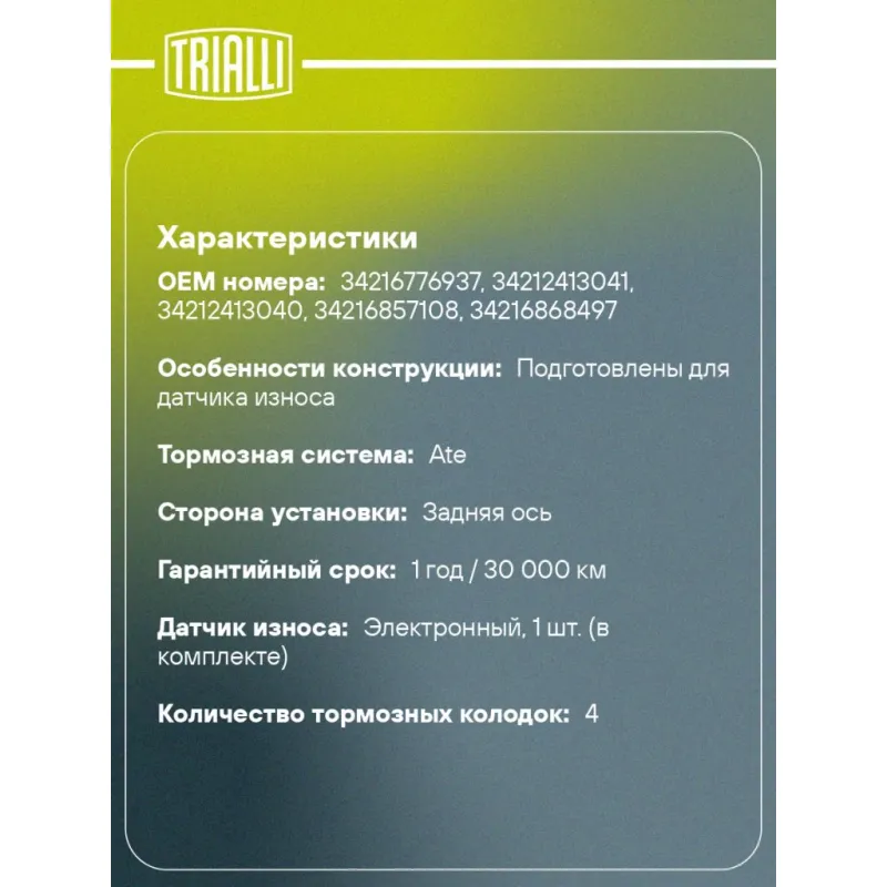 | Особенности конструкции: | Подготовлены для датчика износа |