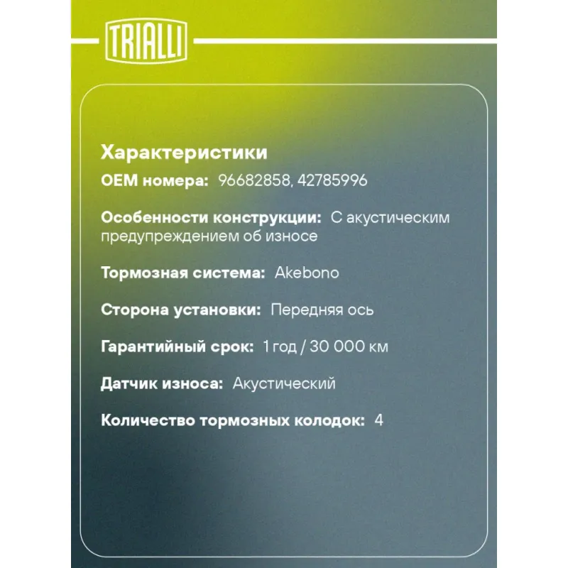 | Гарантийный срок | 1 год / 30 000 км |