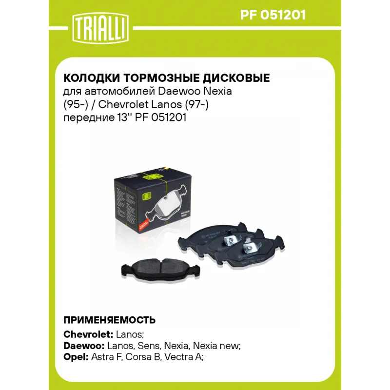 Колодки тормозные дисковые для автомобилей Daewoo Nexia (95-) / Chevrolet Lanos (97-) передние 13'' Характеристики: Артикул: PF 051201 OEM номера: 11046948372, 11046948322, 1605087, 1605455, 1605810, 1605824, 1605881, 1605907, 90421736, 90442995, 90485140, 90510331, 93176120, EC11046948372, 11046148, 90374747, 90374748, 93192639 Количество на автомобиль: 1 Сопутствующие товары:: DF 051101, DF 051102 Сторона установки: передняя ось Особенности конструкции:: Подготовлены для датчика износа WVA: 21353-20547 Тормозная система: ATE Гарантийный срок: 1 год / 30 000 км Датчик износа: Опционально Количество тормозных колодок: 4 Сопутствующий товар: Диски тормозные: DF 051102 Ширина 1, мм: 140 Ширина 2, мм: 141,2 Высота 1, мм: 48,2 Высота 2, мм: 58,3 Толщина, мм: 16,8 Материал фрикционной накладки: Low-Metallic Сопутствующий товар: Шланги тормозные: BF 0576; BF 0577; BF 0581; BF 4711; BF 4712 Сопутствующий товар: Суппорты тормозные: CF 052101; CF 052102 Подходит для авто: Chevrolet Lanos (05-) Daewoo Lanos (97-), Sens (02-), Nexia (94-), Nexia (94-), Nexia new (08-) Opel Astra F (91-), Corsa B (91-), Vectra A (88-) Для проверки применяемости отправьте VIN автомобиля через вкладку "Есть вопросы о товаре?" Комплектация: Колодка тормозная - 4 шт Гарантия: от 1 года.