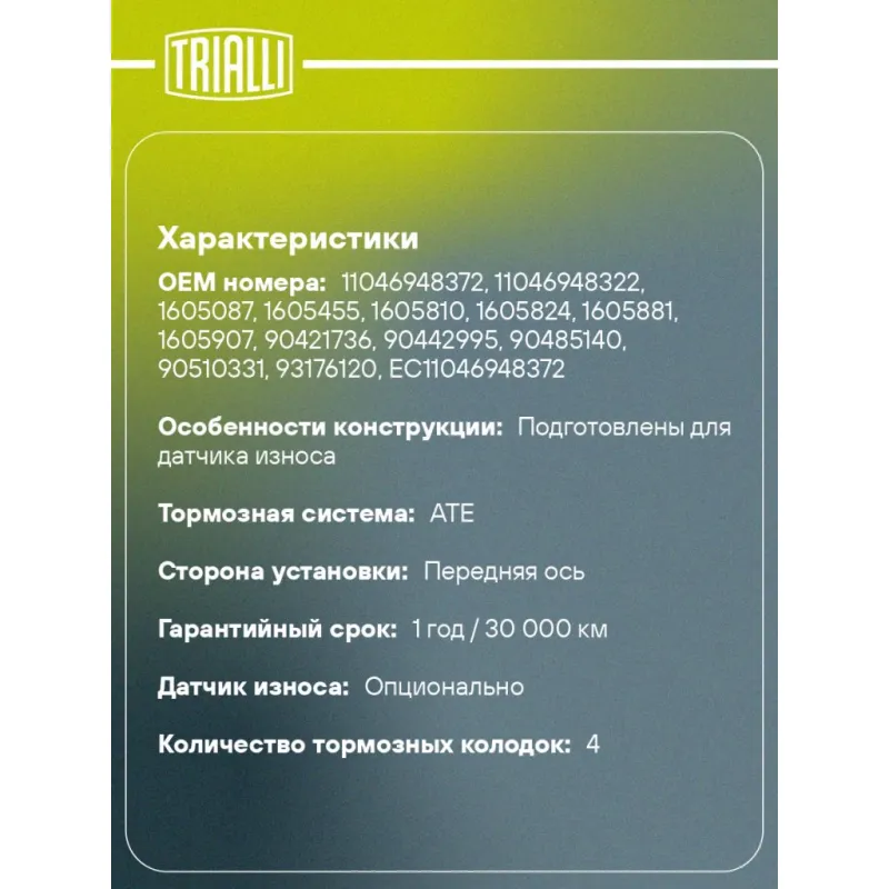 | Гарантийный срок | 1 год / 30 000 км |