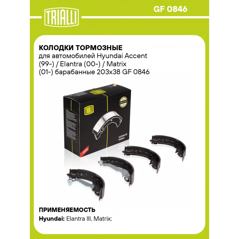 Колодки тормозные для автомобилей Hyundai Accent (99-) / Elantra (00-) / Matrix (01-) барабанные 203x38 GF 0846 TRIALLI