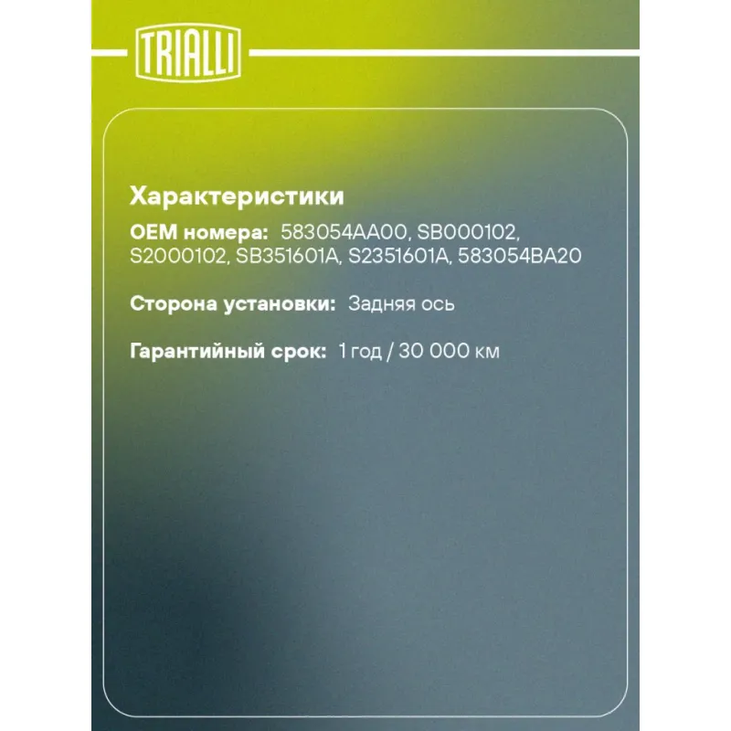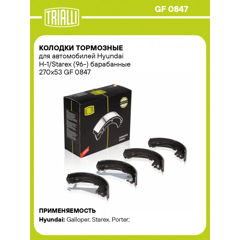 Колодки тормозные для автомобилей Hyundai H-1/Starex (96-) барабанные 270x53 Характеристики: Артикул: GF 0847 OEM номера: 583054AA00, SB000102, S2000102, SB351601A, S2351601A, 583054BA20 Гарантийный срок: 1 год / 30 000 км Сторона установки: задняя ось Количество на автомобиль: 1 Сопутствующие товары:: CF 0132, CF 0133 Ширина, мм: 53 Диаметр, мм: 270 Товарная линейка: BLACK Подходит для авто: Hyundai Galloper (98-), Starex (H-1) (96-), Porter (H-100/TagAZ) (96-), H-100 (93-) Для проверки применяемости отправьте VIN автомобиля через вкладку "Есть вопросы о товаре?" Комплектация: Колодка тормозная - 4 шт Гарантия: от 1 года.