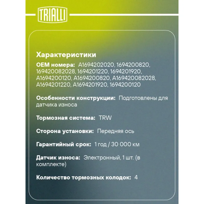 Колодки тормозные дисковые для автомобилей Mercedes A (W169) (04-) 2.0i/2.0D передние в комплекте с датчиком Характеристики: Артикул: PF 4158 OEM номера: A1694202020, 169 420 01 20, A 169 420 19 20, A 169 420 12 20, A169 420 082028, A 169 420 08 20, A 169 420 01 20, 169 420 19 20, 169 420 12 20, 169 420 082028, 169 420 08 20 Количество на автомобиль: 1 Сторона установки: Передняя ось Особенности конструкции:: Подготовлены для датчика износа WVA: 23881 Тормозная система: TRW Гарантийный срок: 1 год / 30 000 км Датчик износа: Электронный, 1 шт. (в комплекте) Количество тормозных колодок: 4 Ширина, мм: 132 Высота, мм: 70 Толщина, мм: 20 Подходит для авто: Mercedes-Benz A-Class W169 (04-), B-Class W245 (05-) Для проверки применяемости отправьте VIN автомобиля через вкладку "Есть вопросы о товаре?" Комплектация: Колодка тормозная - 4 шт Датчик износа - 1 шт Гарантия: от 1 года.