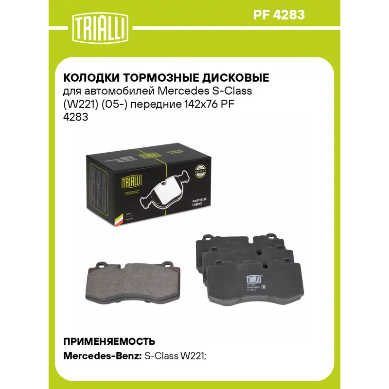 Колодки тормозные дисковые для автомобилей Mercedes S-Class (W221) (05-) передние 142x76 Характеристики: Артикул: PF 4283 OEM номера: 0044206220, A0054207820, A0044208020, A0044206220, 0054207820, 0044208020 Количество на автомобиль: 1 Сторона установки: Передняя ось Особенности конструкции:: Подготовлены для датчика износа WVA: 23960 Тормозная система: Brembo Гарантийный срок: 1 год / 30 000 км Датчик износа: Опционально Количество тормозных колодок: 4 Сопутствующий товар: Диски тормозные: DF 150103; DF 150104 Ширина, мм: 142 Высота, мм: 76 Толщина, мм: 18 Подходит для авто: Mercedes-Benz S-Class W221 (05-), E-Class W211 (02-) Для проверки применяемости отправьте VIN автомобиля через вкладку "Есть вопросы о товаре?" Комплектация: Колодка тормозная - 4 шт Гарантия: от 1 года.