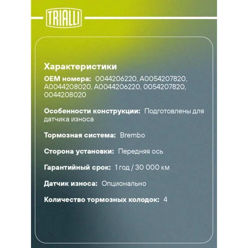 | Особенности конструкции: | Подготовлены для датчика износа |