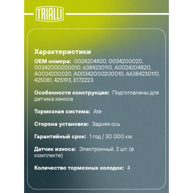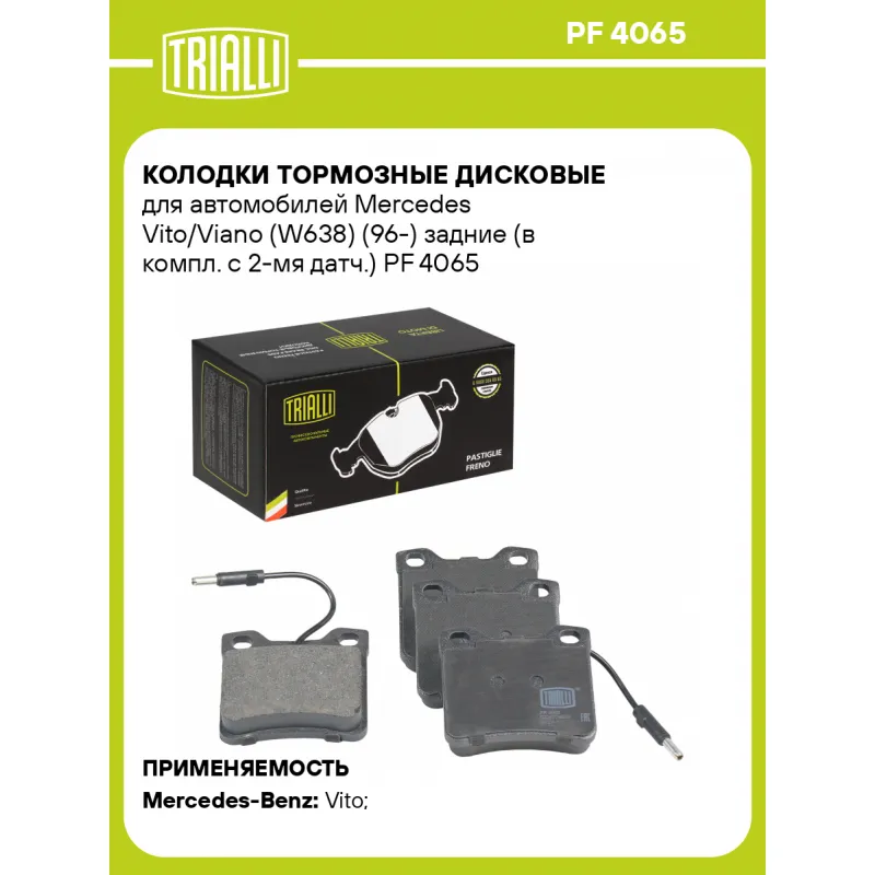 Колодки тормозные дисковые для автомобилей Mercedes Vito/Viano (W638) (96-) задние (в компл. с 2-мя датч.) Характеристики: Артикул: PF 4065 OEM номера: 0024204820, 0034200020, 00342000200010, 6384230110, A0024204820, A0034200020, A00342000200010, A6384230110, 425081, 425193, E172223 Количество на автомобиль: 1 Сторона установки: Задняя ось Особенности конструкции:: Подготовлены для датчика износа WVA: 21904, 21278 Тормозная система: Ate Гарантийный срок: 1 год / 30 000 км Датчик износа: Электронный, 2 шт. (в комплекте) Количество тормозных колодок: 4 Ширина, мм: 63,5 Высота, мм: 57,1 Толщина, мм: 16,9 Подходит для авто: Mercedes-Benz Vito (W638) (96-) Для проверки применяемости отправьте VIN автомобиля через вкладку "Есть вопросы о товаре?" Комплектация: Датчик износа - 2 шт Колодка тормозная - 4 шт Гарантия: от 1 года.