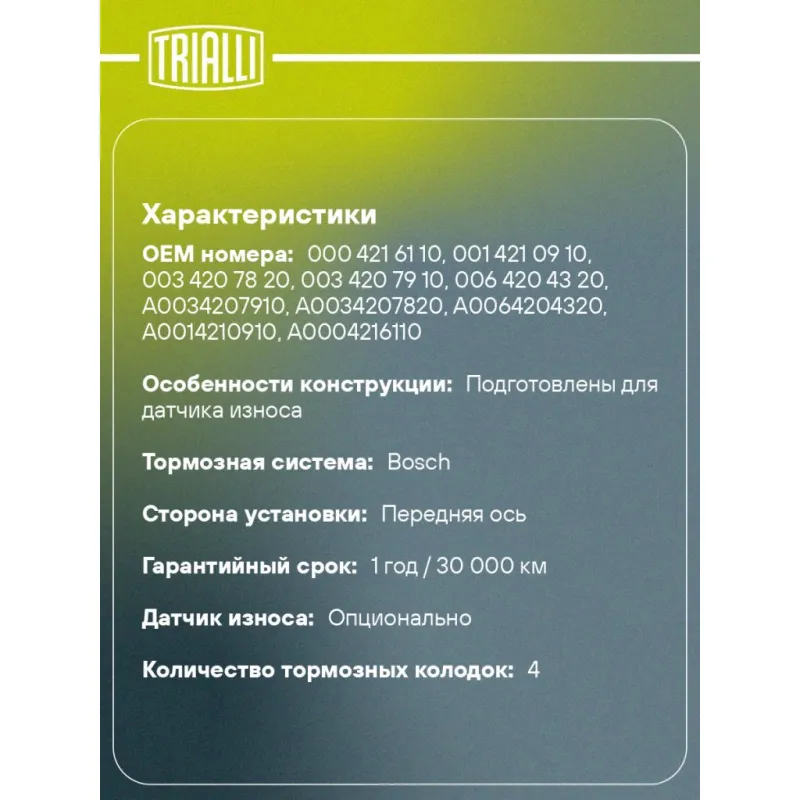 | Особенности конструкции: | Подготовлены для датчика износа |