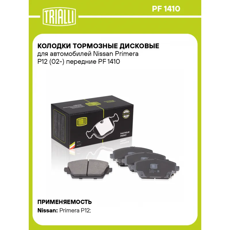 Колодки тормозные дисковые для автомобилей Nissan Primera P12 (02-) передние Характеристики: Артикул: PF 1410 OEM номера: 41060AV110, 41060AV125, 410604U126, 41060AV126, 410604U125 Количество на автомобиль: 1 Сопутствующие товары:: с винтами тормозных сателлитов Сторона установки: передняя ось Особенности конструкции:: С акустическим предупреждением об износе Тормозная система: TRW Гарантийный срок: 1 год / 30 000 км Датчик износа: Акустический Количество тормозных колодок: 4 Сопутствующий товар: Диски тормозные: DF 140113; DF 140120 Ширина, мм: 131,7 Высота, мм: 58,5 Толщина, мм: 17,2 Материал фрикционной накладки: Low-Metallic Подходит для авто: Nissan Primera P12 (02-), Primera P12 (02-) Для проверки применяемости отправьте VIN автомобиля через вкладку "Есть вопросы о товаре?" Комплектация: Колодка тормозная - 4 шт Гарантия: от 1 года.