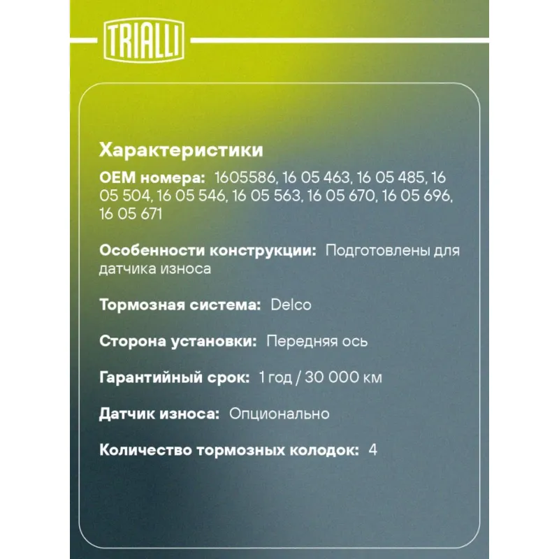 | Особенности конструкции: | Подготовлены для датчика износа |