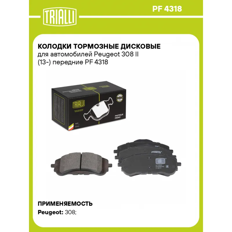 Колодки тормозные дисковые для автомобилей Peugeot 308 II (13-) передние Характеристики: Артикул: PF 4318 OEM номера: 1610428780, 1619790980, 1647860280 Количество на автомобиль: 1 Сторона установки: Передняя ось Особенности конструкции:: Не подготовлены для датчика износа WVA: 25895, 25896 Тормозная система: Bosch Гарантийный срок: 1 год / 30 000 км Датчик износа: Не предусмотрен Количество тормозных колодок: 4 Сопутствующий товар: Диски тормозные: DF 200101 Ширина, мм: 148 Высота 1, мм: 58,1 Высота 2, мм: 63,2 Толщина, мм: 19 Сопутствующий товар: Суппорты тормозные: CF 095117; CF 095118 Подходит для авто: Peugeot 308 (13-), 308 (13-) Для проверки применяемости отправьте VIN автомобиля через вкладку "Есть вопросы о товаре?" Комплектация: Колодка тормозная - 4 шт Гарантия: от 1 года.