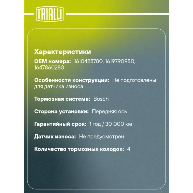| Гарантийный срок | 1 год / 30 000 км |