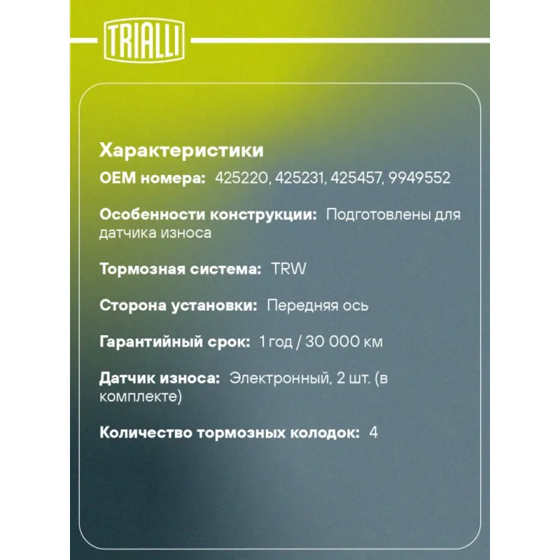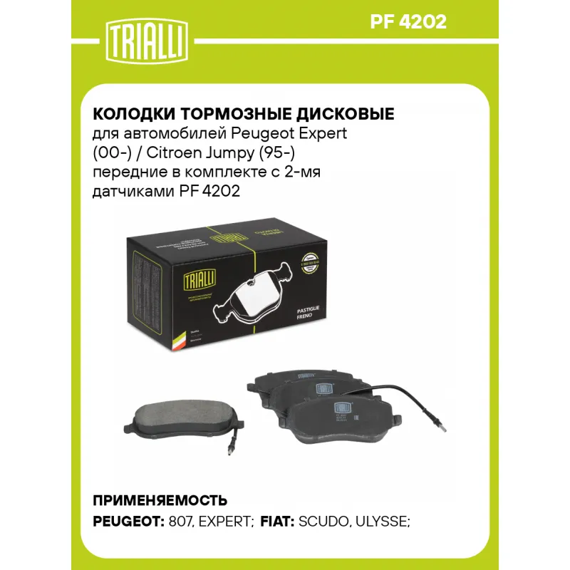 Колодки тормозные дисковые для автомобилей Peugeot Expert (00-) / Citroen Jumpy (95-) передние в комплекте с 2-мя датчиками Характеристики: Артикул: PF 4202 OEM номера: 425220, 425231, 425457, 9949552 Количество на автомобиль: 1 Сторона установки: Передняя ось Особенности конструкции:: Подготовлены для датчика износа Тормозная система: TRW Гарантийный срок: 1 год / 30 000 км Датчик износа: Электронный, 2 шт. (в комплекте) Количество тормозных колодок: 4 Ширина, мм: 146,5 Высота, мм: 59,7 Толщина, мм: 18,2 Материал фрикционной накладки: Low-Metallic Комплектация: Датчик износа - 2 шт Колодка тормозная - 4 шт Гарантия: от 1 года.