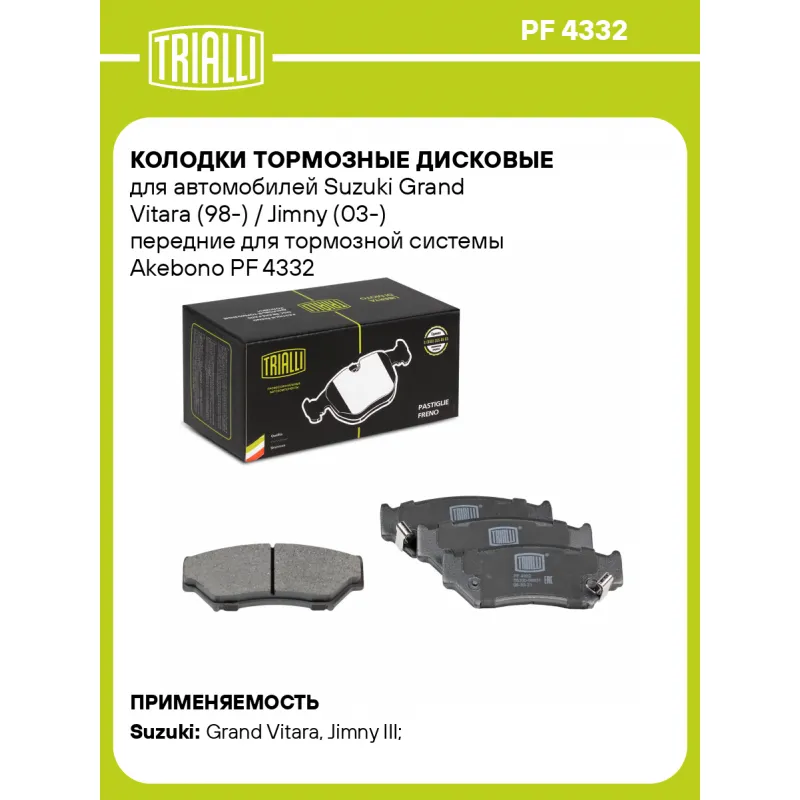 Колодки тормозные дисковые для автомобилей Suzuki Grand Vitara (98-) / Jimny (03-) передние для тормозной системы Akebono Характеристики: Артикул: PF 4332 OEM номера: 55200-56831, 55200-56831-000, 55200-56870, 55200-56870-000, 55200-56870-B01, 55200-56871, 55200-56B40, 55200-56B41, 5520065D00, 5520065D00000, 5520056820, 552005683, 5520056830, 5520056840 Количество на автомобиль: 1 Сторона установки: Передняя ось Особенности конструкции:: С акустическим предупреждением об износе WVA: 21907, 21908, 21909 Тормозная система: Akebono Гарантийный срок: 1 год / 30 000 км Датчик износа: Акустический Количество тормозных колодок: 4 Сопутствующий товар: Диски тормозные: DF 240111 Ширина, мм: 116,7 Высота, мм: 45,5 Толщина, мм: 15,4 Подходит для авто: Suzuki Grand Vitara (98-), Jimny III (03-) Для проверки применяемости отправьте VIN автомобиля через вкладку "Есть вопросы о товаре?" Комплектация: Колодка тормозная - 4 шт Гарантия: от 1 года.