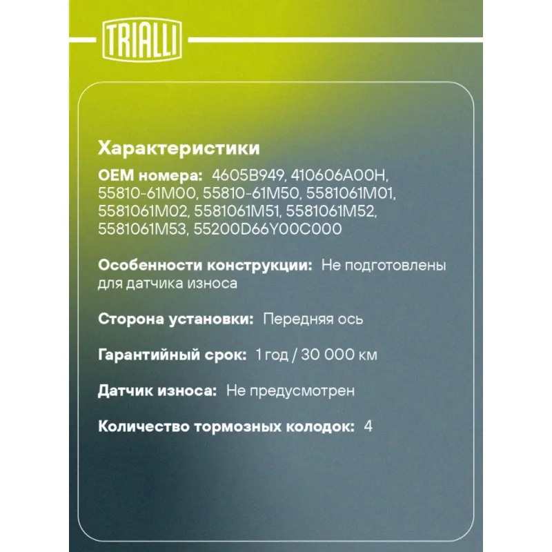 | Особенности конструкции: | Не подготовлены для датчика износа |