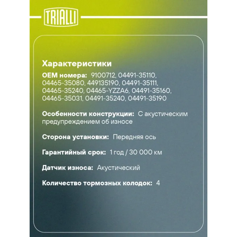 Колодки тормозные дисковые для автомобилей Toyota Land Cruiser Prado (96-) передние Характеристики: Артикул: PF 1938 OEM номера: 9100712, 04491-35110, 04465-35080, 449135190, 04491-35111, 04465-35240, 04465-YZZA6, 04491-35160, 04465-35031, 04491-35240, 04491-35190, 04491-35251, 04491-60090, 04465-35200, 04465-60030, 04491-35171, 04465-YZZA5, 04465YZZDH, 04465-35190, 04465-35100, 04491-35250, 04491-60080, 04491-35260, 04465-35040, 04465-60260, 04465-35230, 04465-35061, 04465-YZZAF, 04491-35170, 04465-35030, 04465-35280, 04465-60130, 04491-35210, 04465YZZDJ, J04 465 350 40, J04 491 351 60 Количество на автомобиль: 1 Сторона установки: Передняя ось Особенности конструкции:: С акустическим предупреждением об износе Гарантийный срок: 1 год / 30 000 км Датчик износа: Акустический Количество тормозных колодок: 4 Сопутствующий товар: Диски тормозные: DF 190605 Ширина 1, мм: 119,2 Ширина 2, мм: 119,2 Высота 1, мм: 64,5 Высота 2, мм: 73,5 Толщина, мм: 15 Материал фрикционной накладки: Low-Metallic Подходит для авто: Toyota Land Cruiser Prado 90 (96-), Hilux (97-), 4Runner (N180) (95-), 4Runner (89-) Для проверки применяемости отправьте VIN автомобиля через вкладку "Есть вопросы о товаре?" Комплектация: Колодка тормозная - 4 шт Гарантия: от 1 года.