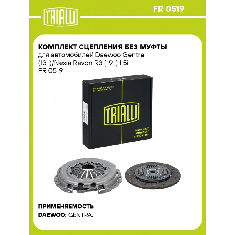 Комплект сцепления без муфты для автомобилей Daewoo Gentra (13-)/Nexia Ravon R3 (19-) 1.5i Характеристики: Артикул: FR 0519 OEM номера: 25186832, 25186833, 25197363, 25197362 Профиль ступицы: 18.3 x 20.6 Число зубцов, шт.: 24 Диаметр, мм: 215 Гарантийный срок: 2 года/60 000 км Количество на автомобиль: 1 Товарная линейка: BLACK ... Читать полностью →