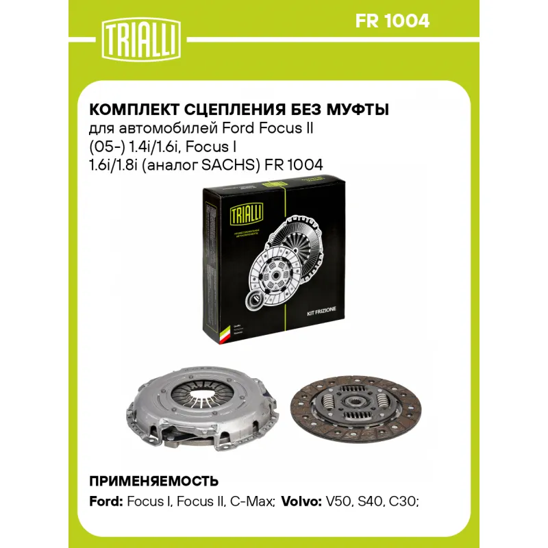 Комплект сцепления без муфты для автомобилей Ford Focus II (05-) 1.4i/1.6i, Focus I 1.6i/1.8i (аналог SACHS) Характеристики: Артикул: FR 1004 OEM номера: 1679189, 7G91-7550-A1A, 7G91-7550-A1B, 7G91-7550-A2A, 1450951, 3M51-7563-AD1, AV61-7563-DA, 3M51-7563-AF, 3M51-7563-AH, 30759970, 30787789, 31325444, RM3M51-7540-AF, RM3M51-7540-AH, RM3M51-7540-AJ, RM3M51-7540-A1K, RM8V21-7540-E1A, 1 355 806, 1343810, 1343811, 1343812, 1385806, 1385807, 1385808, 1423902, 1432454, 1432483, 1473808, 1473814, 1495800, 1679190, 1716731, 1746881, 1772140, 1772150, 3M51-7540-A1E, 3M51-7540-A1F, 3M51-7540-A1G, 3M51-7540-A1H, 3M51-7540-A1J, 3M51-7540-A1K, 3M51-7540-A2E, 3M51-7540-A2F, 3M51-7540-A2G, 3M51-7540-A2H, 3M51-7540-A3E, 3M51-7540-A3F, 8V21-7540-E1A, 1 252 272, 1 354 396, 1742517 Гарантийный срок: 2 года/60 000 км Количество на автомобиль: 1 Диаметр, мм: 220 Число зубцов, шт.: 17 Профиль ступицы: 17 x 19.9 Сопутствующий товар: Комплекты сцепления: FR 1016 Сопутствующий товар: Муфты сцепления: CT 1001, CT 1002 Тип двигателя: ASDA, ASDB, B 4164 S3, EYDB, EYDC, EYDD, EYDE, EYDF, EYDG, EYDI, EYDJ, EYDL, FYDA, FYDB, FYDC, FYDD, FYDH, HWDA, HWDB, SHDA, SHDB, SHDC, HXDA, HXDB, SIDA, HXJA, HXJB, HXJE, RVJA, PNBA, RHBA, U5JA, UEJB, UEJE Тип КПП: 5MT Товарная линейка: BLACK Подходит для авто: Ford Focus I (98-), Focus II (05-), C-Max (03-), C-Max (07-), Fiesta VI (08-), Mondeo IV (07-) Volvo V50 (04-), S40 (04-), C30 (06-) Для проверки применяемости отправьте VIN автомобиля через вкладку "Есть вопросы о товаре?" Комплектация: Диск сцепления ведомый - 1 шт Диск сцепления нажимной - 1 шт Гарантия: от 1 года.