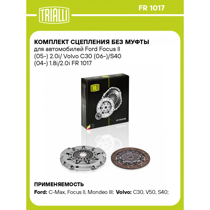 Комплект сцепления без муфты для автомобилей Ford Focus II (05-) 2.0i/ Volvo C30 (06-)/S40 (04-) 1.8i/2.0i Характеристики: Артикул: FR 1017 OEM номера: 1 385 369, 30759484, 1 147 427, RM3M51-7540-BD, RM3M51-7540-B1D, 1 255 557, 1 423 903, 1255577, 1255578, 1255579, 1385810, 1385812, 1772147, 3M51-7540-B1C, 3M51-7540-B1D, 3M51-7540-B2C, 3M51-7540-B2D, 3M51-7540-B3C, 3M51-7540-B3D, 30681125 Особенности конструкции:: для двухмассового маховика Гарантийный срок: 2 года/60 000 км Количество на автомобиль: 1 Диаметр, мм: 228 Число зубцов, шт.: 23 Профиль ступицы: 26 x 23.2 Сопутствующий товар: Комплекты сцепления: FR 1018,FR 1025 Сопутствующий товар: Муфты сцепления: CT 1005, CT 1003 Сопутствующий товар: Цилиндры сцепления: CF 8012 Товарная линейка: BLACK Подходит для авто: Ford C-Max (03-), Focus II (05-), Mondeo III (00-) Volvo C30 (06-), V50 (04-), S40 (04-) Для проверки применяемости отправьте VIN автомобиля через вкладку "Есть вопросы о товаре?" Комплектация: Диск сцепления ведомый - 1 шт Диск сцепления нажимной - 1 шт Гарантия: от 1 года.
