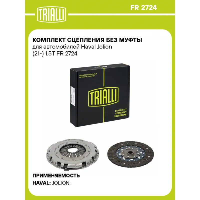 Комплект сцепления без муфты для автомобилей Haval Jolion (21-) 1.5T Характеристики: Артикул: FR 2724 OEM номера: 1603000XSB17A, 1601200XSY13A, 1601100XSY13A Профиль ступицы: 19 x 22.15 Число зубцов, шт.: 20 Диаметр, мм: 200 Гарантийный срок: 2 года/60 000 км Количество на автомобиль: 1 Товарная линейка: BLACK Комплектация: Диск сцепления ведомый - 1 шт Диск сцепления нажимной - 1 шт Гарантия: от 1 года.
