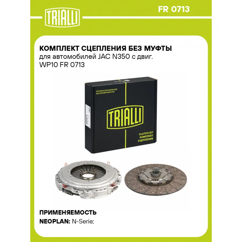 Комплект сцепления без муфты для автомобилей JAC N350 с двиг. WP10 Характеристики: Артикул: FR 0713 OEM номера: 41200-Y44Q0, 41100-Y44Q0 Профиль ступицы: 41.2 x 52.3 Число зубцов, шт.: 10 Диаметр, мм: 430 Гарантийный срок: 12 месяцев без ограничения по пробегу Тип двигателя: WP10.350E53 Количество на автомобиль: 1 Товарная линейка: BLACK Комплектация: Диск сцепления ведомый - 1 шт Диск сцепления нажимной - 1 шт Гарантия: от 1 года.