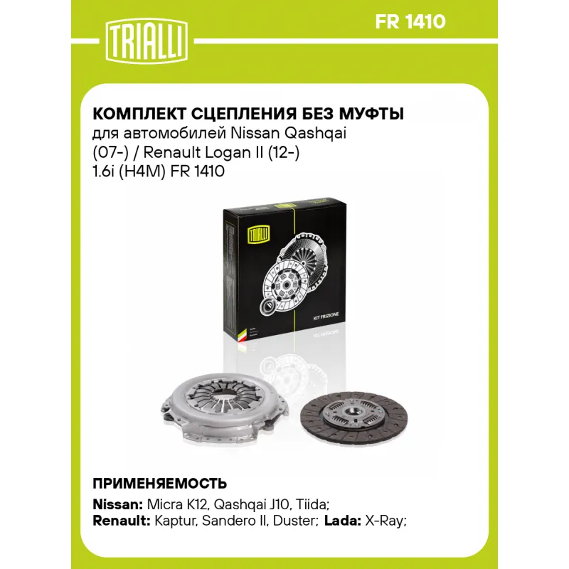 Комплект сцепления без муфты для автомобилей Nissan Qashqai (07-) / Renault Logan II (12-) 1.6i (H4M) Характеристики: Артикул: FR 1410 OEM номера: 30210-JX00C, 30100-ED80B, 30100-ED800, 30210-ED800, 30210-JX00A, 30100-1HM0A, C0210-00Q0B, C021000Q0E, 30100-3BS0A, 30100-JX00A, 30100-JX00C, 30205-3BS0A, 30210-3BS0A, 30210-JX00B, 30 20 541 00R, 30 21 073 80R Количество на автомобиль: 1 Диаметр, мм: 215 Число зубцов, шт.: 26 Гарантийный срок: 2 года/60 000 км Профиль ступицы: 20x21.9 Товарная линейка: BLACK Подходит для авто: Nissan Micra K12 (02-), Qashqai J10 (06-), Tiida (04-), Note (06-) Renault Kaptur (16-), Sandero II (14-), Duster (10-), Logan II (12-) ВАЗ X-Ray (15-) Для проверки применяемости отправьте VIN автомобиля через вкладку "Есть вопросы о товаре?" Комплектация: Диск сцепления ведомый - 1 шт Диск сцепления нажимной - 1 шт Гарантия: от 1 года.