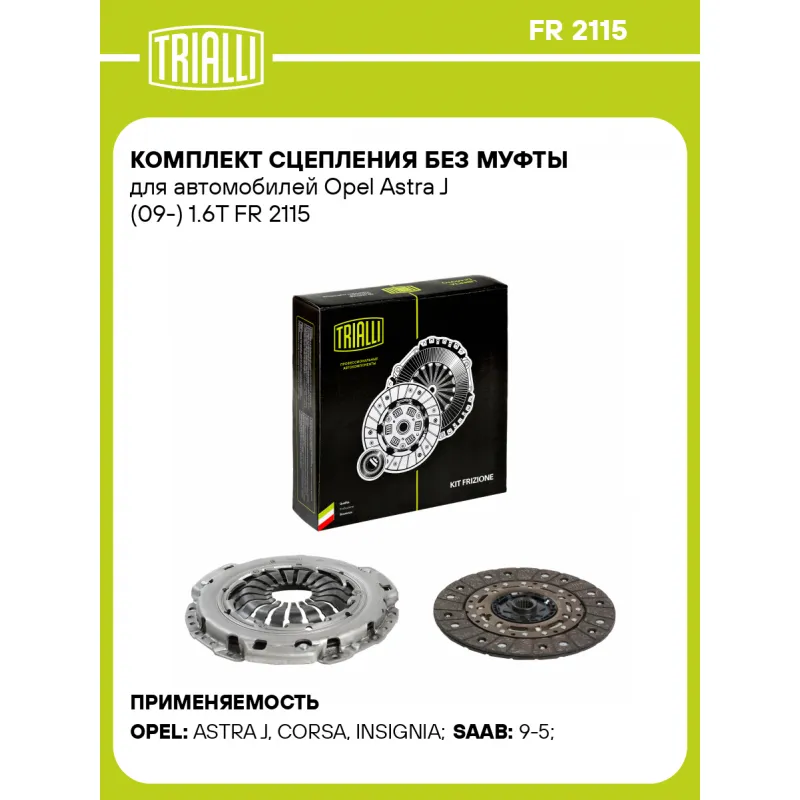 Комплект сцепления без муфты для автомобилей Opel Astra J (09-) 1.6T Характеристики: Артикул: FR 2115 OEM номера: 6 66 360, 55575959, 6 66 091, 93195502, 55564556, 6 66 097, 95518823, 55562239, 93186231, 6 66 095, 55355561, 55576165, 6 64 092 Профиль ступицы: 20,2х23,2 Число зубцов, шт.: 20 Диаметр, мм: 216 Гарантийный срок: 2 г... Читать полностью →