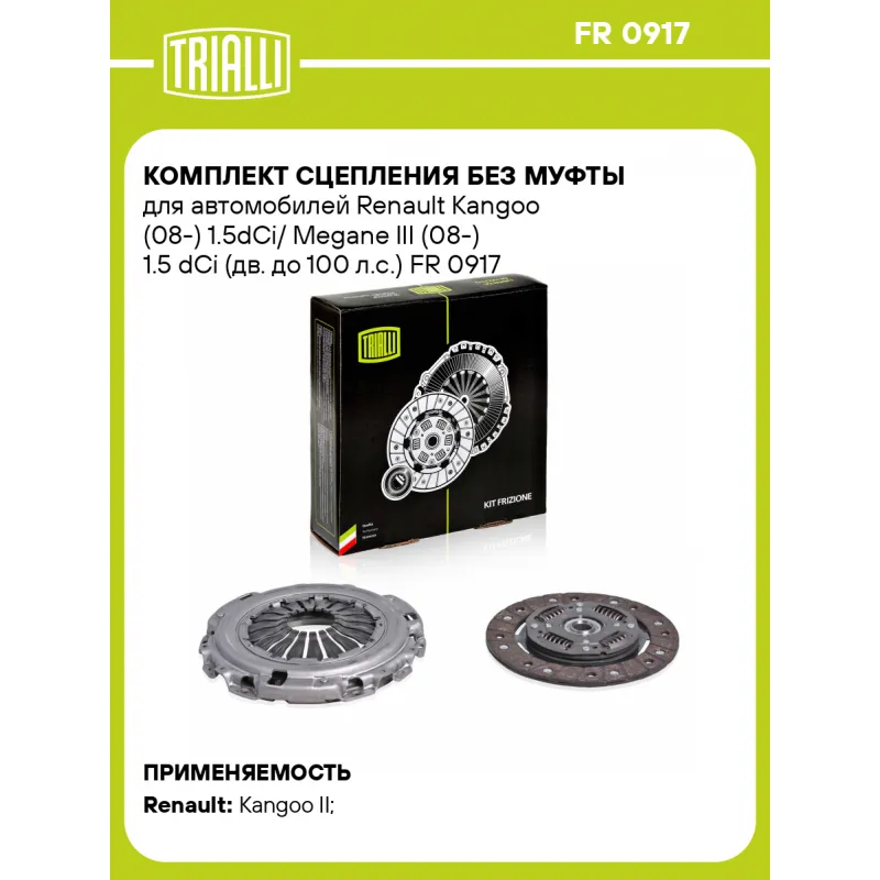 Комплект сцепления без муфты для автомобилей Renault Kangoo (08-) 1.5dCi/ Megane III (08-) 1.5 dCi (дв. до 100 л.с.) Характеристики: Артикул: FR 0917 OEM номера: A 415 250 00 01, A 415 250 05 01, 415 250 00 01, 415 250 05 01, 23354-00QAD, 23354-00QAK-, 23354-00QAR-, 86 60 004 315, 30 20 583 24R, 77 01 475 361, 77 01 476 180, 77 01 478 779 Количество на автомобиль: 1 Диаметр, мм: 215 Число зубцов, шт.: 26 Гарантийный срок: 2 года/60 000 км Профиль ступицы: 20х22 Сопутствующий товар: Комплекты сцепления: FR 0913; FR 0918; FR 0919 Товарная линейка: BLACK Подходит для авто: Renault Kangoo II (07-) Для проверки применяемости отправьте VIN автомобиля через вкладку "Есть вопросы о товаре?" Комплектация: Диск сцепления ведомый - 1 шт Диск сцепления нажимной - 1 шт Гарантия: от 1 года.