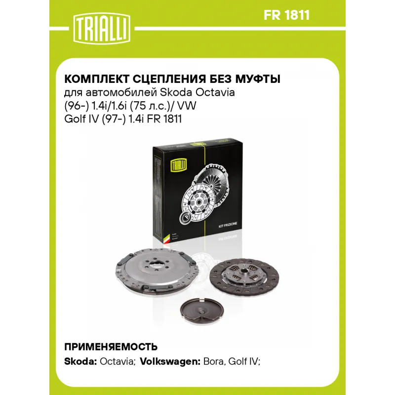 Комплект сцепления без муфты для автомобилей Skoda Octavia (96-) 1.4i/1.6i (75 л.с.)/ VW Golf IV (97-) 1.4i Характеристики: Артикул: FR 1811 OEM номера: 036 198 141 X, 032 141 025 M, 032 141 025 MX, 032 141 032, 032 141 032 X, 032 141 032 B, 032 141 032 BX, 036 198 141 Количество на автомобиль: 1 Диаметр, мм: 200 Число зубцов, шт.: 28 Гарантийный срок: 2 года/60 000 км Профиль ступицы: 22.12x20.31 Товарная линейка: BLACK Подходит для авто: Skoda Octavia (96-) Volkswagen Bora (99-), Golf IV (97-) Для проверки применяемости отправьте VIN автомобиля через вкладку "Есть вопросы о товаре?" Комплектация: Диск сцепления ведомый - 1 шт Диск сцепления нажимной - 1 шт Диск сцепления выжимной - 1 шт Гарантия: от 1 года.