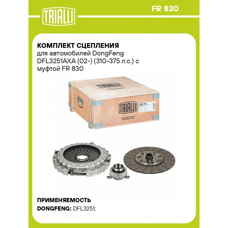 Комплект сцепления для автомобилей DongFeng DFL3251AXA (02-) (310-375 л.с.) с муфтой Характеристики: Артикул: FR 830 OEM номера: 1601ZB1T-130, 1601090-T0501, 1601080-T0802 Профиль ступицы: 41.1 x 50.8 Число зубцов, шт.: 10 Диаметр, мм: 430 Гарантийный срок: 12 месяцев без ограничения по пробегу Количество на автомобиль: 1 Сопутс... Читать полностью →