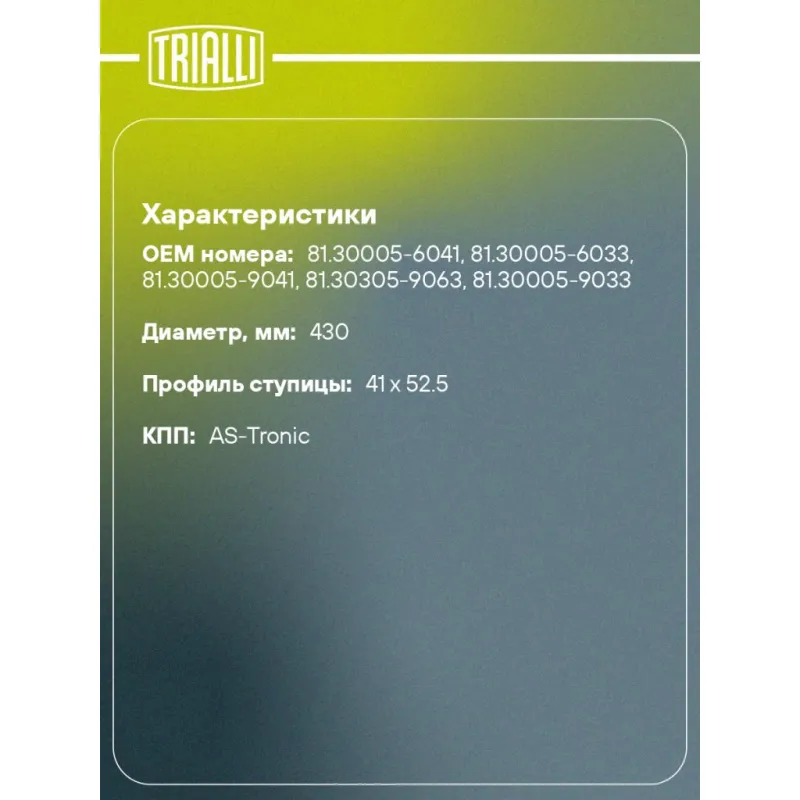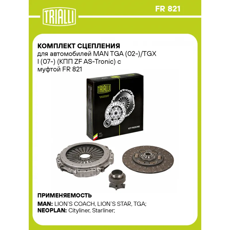 Комплект сцепления для автомобилей MAN TGA (02-)/TGX I (07-) (КПП ZF AS-Tronic) с муфтой Характеристики: Артикул: FR 821 OEM номера: 81.30005-6041, 81.30005-6033 , 81.30005-9041, 81.30305-9063, 81.30005-9033 Гарантийный срок: 12 месяцев без ограничения по пробегу Количество на автомобиль: 1 Диаметр, мм: 430 Число зубцов, шт.: 10 Профиль ступицы: 41 x 52.5 Комплектация (кол-во деталей, описание): FS 706, FD 407, CT 0704 Сопутствующий товар: Ведомые диски сцепления: FD 407 Сопутствующий товар: Нажимные диски сцепления: FS 706 Сопутствующий товар: Муфты сцепления: CT 0704 Тип КПП: Коробка передач ZF Товарная линейка: BLACK КПП: AS-Tronic Двигатель: D 2866 LF26, D 2866 LF27, D 2066 LF 02, D 2676 LF 47 Комплектация: Диск сцепления ведомый - 1 шт Диск сцепления нажимной - 1 шт Муфта выключения сцепления в сборе - 1 шт Гарантия: от 1 года.