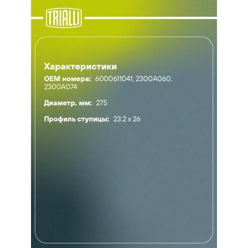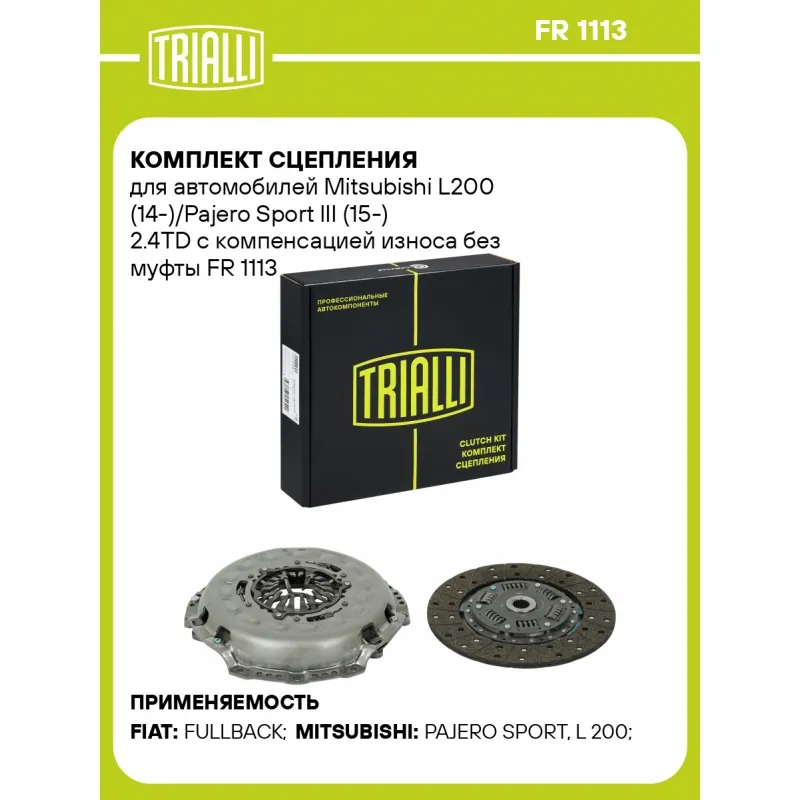 Комплект сцепления для автомобилей Mitsubishi L200 (14-)/Pajero Sport III (15-) 2.4TD с компенсацией износа без муфты Характеристики: Артикул: FR 1113 OEM номера: 6000611041, 2300A060, 2300A074 Профиль ступицы: 23.2 x 26 Число зубцов, шт.: 23 Диаметр, мм: 275 Гарантийный срок: 2 года/60 000 км Сопутствующий товар: Муфты сцепления: CT 1102 Количество на автомобиль: 1 Товарная линейка: BLACK Комплектация: Диск сцепления ведомый - 1 шт Диск сцепления нажимной - 1 шт Гарантия: от 1 года.