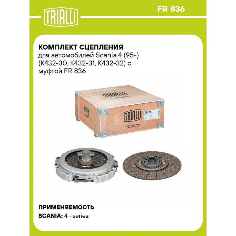 Комплект сцепления для автомобилей Scania 4 (95-) (K432-30, K432-31, K432-32) с муфтой Характеристики: Артикул: FR 836 OEM номера: 1111148, 1321253, 1321258, 1324883, 1340192, 1368697, 571292, 571295, 571300, 571305, 571256, 571262, 571268, 571271, 571283, 571284, 1851631, 1929397, 2164195, 2274550, 2548347, 2824727, 1510032, 1513719, 1513720, 1728165, 1749123, 1749125, 1386931, 1409769, 1412319, 1444110, 1479576, 1499770 Профиль ступицы: 46.2 x 50.5 Число зубцов, шт.: 24 Диаметр, мм: 430 Гарантийный срок: 12 месяцев без ограничения по пробегу Количество на автомобиль: 1 Товарная линейка: BLACK Особенности конструкции: K432-30, K432-31, K432-32 Комплектация: Диск сцепления ведомый - 1 шт Диск сцепления нажимной - 1 шт Муфта выключения сцепления в сборе - 1 шт Гарантия: от 1 года.