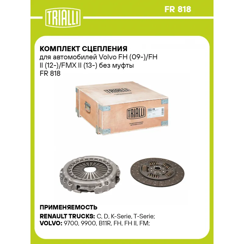 Комплект сцепления для автомобилей Volvo FH (09-)/FH II (12-)/FMX II (13-) без муфты Характеристики: Артикул: FR 818 OEM номера: 85013893, 85022359, 74 85 013 887 Гарантийный срок: 12 месяцев без ограничения по пробегу Количество на автомобиль: 1 Диаметр, мм: 430 Число зубцов, шт.: 24 Профиль ступицы: 46.2 x 50 Сопутствующий товар: Ведомые диски сцепления: FD 405 Товарная линейка: BLACK КПП: AT 2412 E+F, ATO 2612/E Двигатель: DTI 11, D11 K, DTI11-122HH, D11C370, D11K380, D11C330, D13A380, D13C380 Комплектация: Диск сцепления ведомый - 1 шт Диск сцепления нажимной - 1 шт Гарантия: от 1 года.