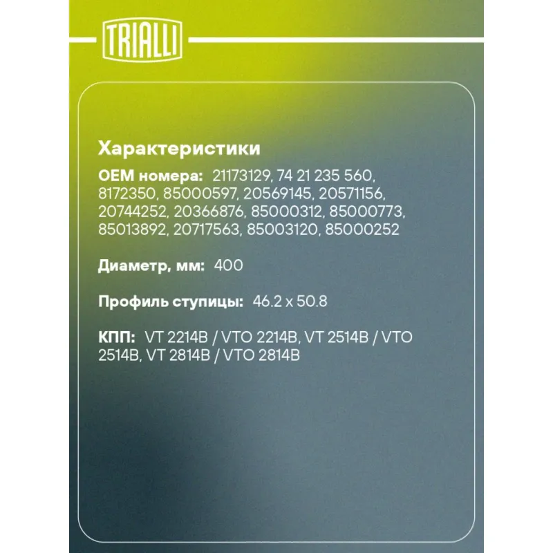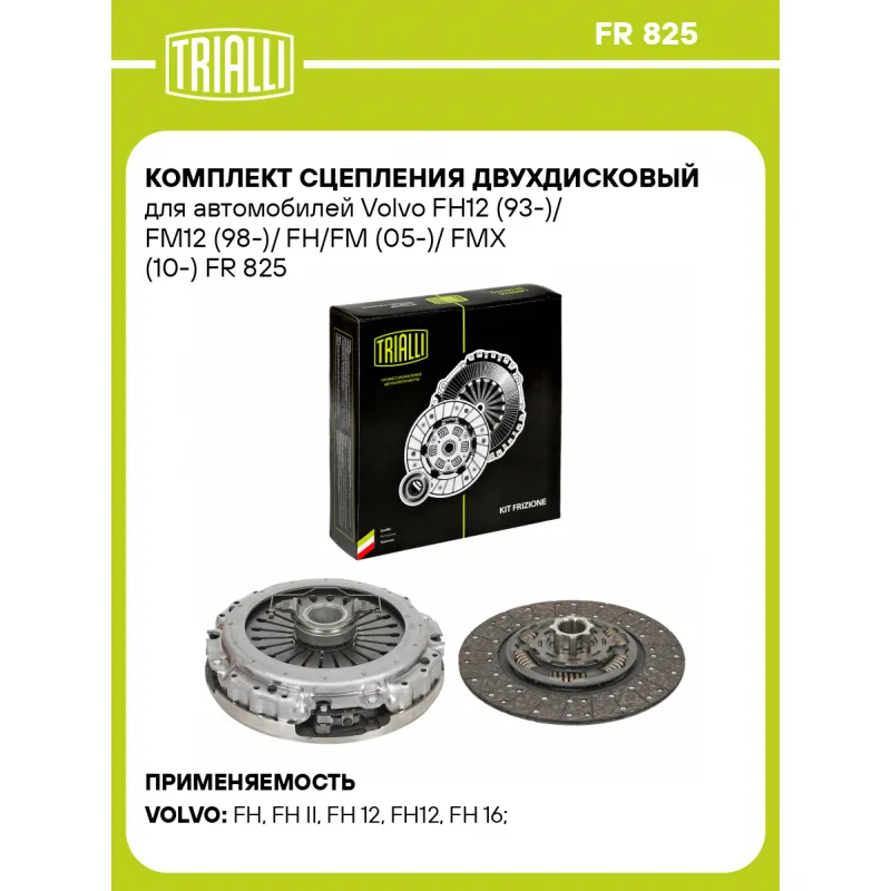 Комплект сцепления двухдисковый для автомобилей Volvo FH12 (93-)/ FM12 (98-)/ FH/FM (05-)/ FMX (10-) Характеристики: Артикул: FR 825 OEM номера: 21173129, 74 21 235 560, 8172350, 85000597, 20569145, 20571156, 20744252, 20366876, 85000312, 85000773, 85013892, 20717563, 85003120, 85000252 Гарантийный срок: 12 месяцев без ограничения по пробегу Количество на автомобиль: 1 Диаметр, мм: 400 Число зубцов, шт.: 24 Профиль ступицы: 46.2 x 50.8 Товарная линейка: BLACK КПП: VT 2214B / VTO 2214B, VT 2514B / VTO 2514B, VT 2814B / VTO 2814B Двигатель: D11A-370, D11C370, D11B390, D11C330, D11K330, D11C370, D11K370, D12A380, D12C380, D12D380, D12C340, D12D340, D12C380, D12D380, D12F390, D13A360, D13B360, D13A400, D13B400, D13B400, D13C380 Особенности конструкции: CD40B-O. CL39D-C Комплектация: Диск сцепления ведомый - 2 шт Диск сцепления нажимной c установленной муфтой - 1 шт Гарантия: от 1 года.