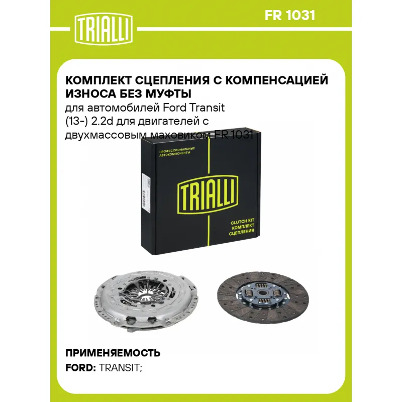 Комплект сцепления с компенсацией износа без муфты для автомобилей Ford Transit (13-) 2.2d для двигателей с двухмассовым маховиком Характеристики: Артикул: FR 1031 OEM номера: 1731737, 1889306 Особенности конструкции:: Диск сцепления нажимной с компенсацией износа, для двигателей с двухдисковым маховиком Профиль ступицы: 23.2 x 26.1 Число зубцов, шт.: 23 Диаметр, мм: 273 Гарантийный срок: 2 года/60 000 км Количество на автомобиль: 1 Товарная линейка: BLACK Комплектация: Диск сцепления ведомый - 1 шт Диск сцепления нажимной - 1 шт Гарантия: от 1 года.