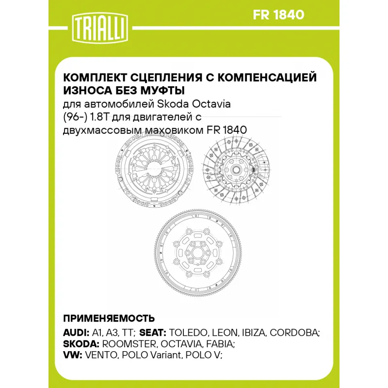 Комплект сцепления с компенсацией износа без муфты для автомобилей Skoda Octavia (96-) 1.8T для двигателей с двухмассовым маховиком Характеристики: Артикул: FR 1840 OEM номера: 028 105 264 G, 028 105 264 K, 038 105 264, 038105264D, 038 105 264 E, 038105264H, 038105264J, 03L 105 266 CD, 06A105264M Особенности конструкции:: Диск сцепления нажимной с компенсацией износа Профиль ступицы: 20.3 x 22.1 Число зубцов, шт.: 28 Диаметр, мм: 225 Гарантийный срок: 2 года/60 000 км Количество на автомобиль: 1 Товарная линейка: BLACK Комплектация: Диск сцепления ведомый - 1 шт Диск сцепления нажимной - 1 шт Маховик - 1 шт Гарантия: от 1 года.