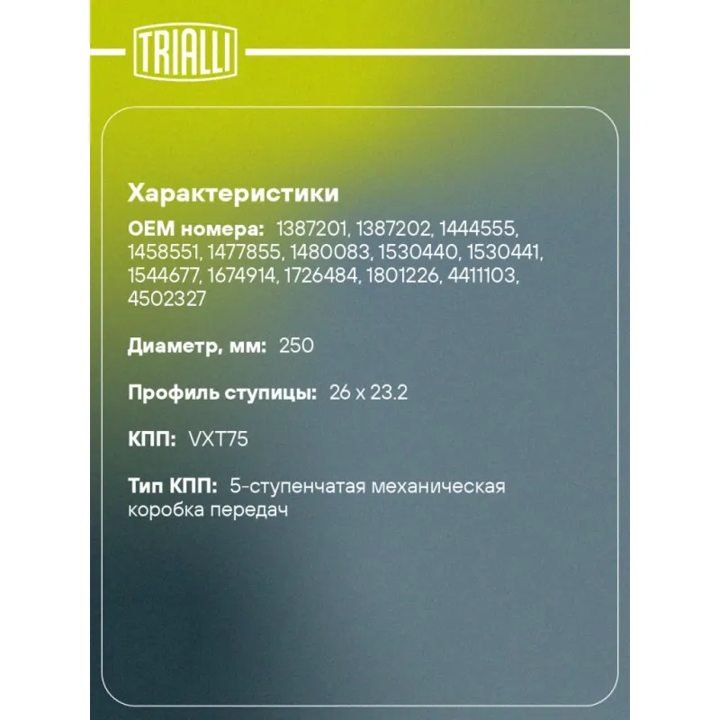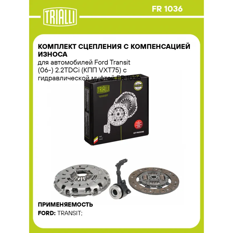 Комплект сцепления с компенсацией износа для автомобилей Ford Transit (06-) 2.2TDCi (КПП VXT75) с гидравлической муфтой FR 1036 TRIALLI
