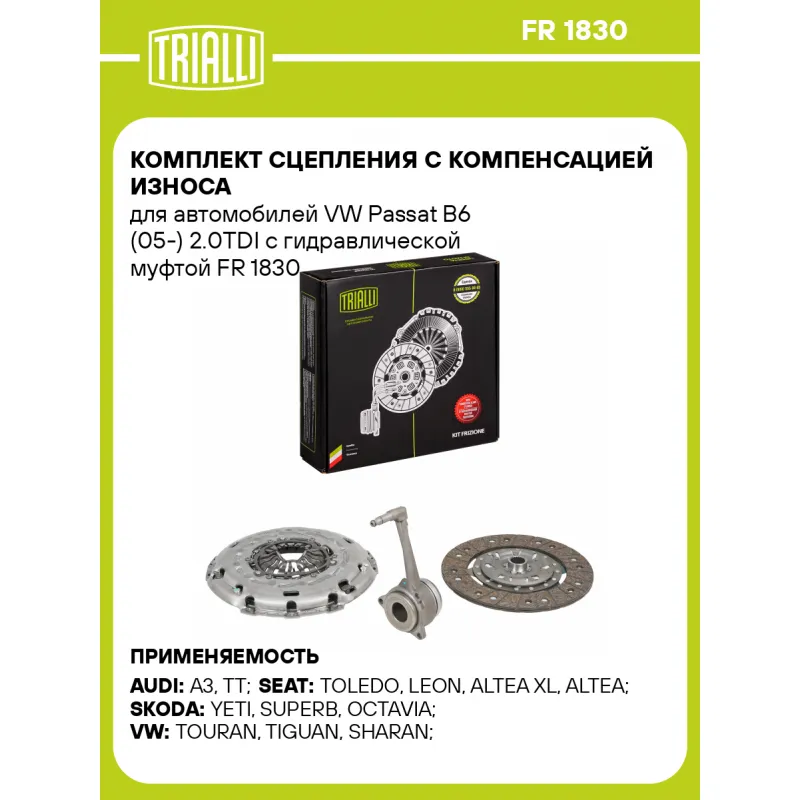 Комплект сцепления с компенсацией износа для автомобилей VW Passat B6 (05-) 2.0TDI с гидравлической муфтой FR 1830 TRIALLI