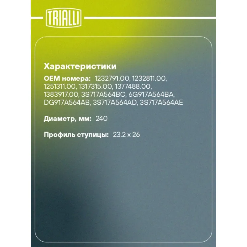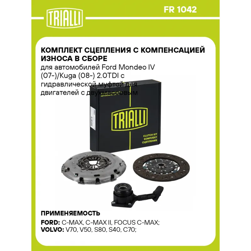 Комплект сцепления с компенсацией износа в сборе для автомобилей Ford Mondeo IV (07-)/Kuga (08-) 2.0TDI с гидравлической муфтой для двигателей с двухмассовым маховиком FR 1042 TRIALLI
