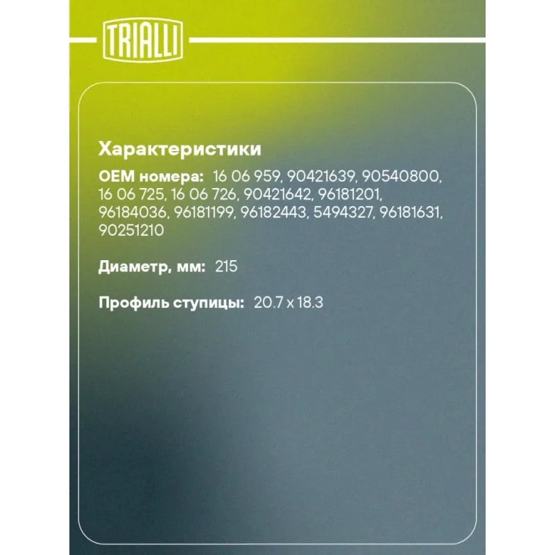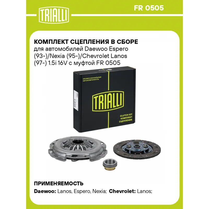 Комплект сцепления в сборе для автомобилей Daewoo Espero (93-)/Nexia (95-)/Chevrolet Lanos (97-) 1.5i 16V с муфтой Характеристики: Артикул: FR 0505 OEM номера: 16 06 959, 90421639, 90540800, 16 06 725, 16 06 726, 90421642, 96181201, 96184036, 96181199, 96182443, 5494327, 96181631, 90251210 Гарантийный срок: 2 года/60 000 км Количество на автомобиль: 1 Диаметр, мм: 215 Число зубцов, шт.: 24 Профиль ступицы: 20.7x18.3 Комплектация (кол-во деталей, описание): FS 0505, FD 0505, CT 0501 Сопутствующий товар: Ведомые диски сцепления: FD 0505 Сопутствующий товар: Нажимные диски сцепления: FS 0505 Сопутствующий товар: Муфты сцепления: CT 0501 Товарная линейка: BLACK Подходит для авто: Daewoo Lanos (97-), Espero (94-), Lanos (97-), Nexia (94-) Chevrolet Lanos (97-) Для проверки применяемости отправьте VIN автомобиля через вкладку "Есть вопросы о товаре?" Комплектация: Диск сцепления ведомый - 1 шт Диск сцепления нажимной - 1 шт Муфта выключения сцепления в сборе - 1 шт Гарантия: от 1 года.