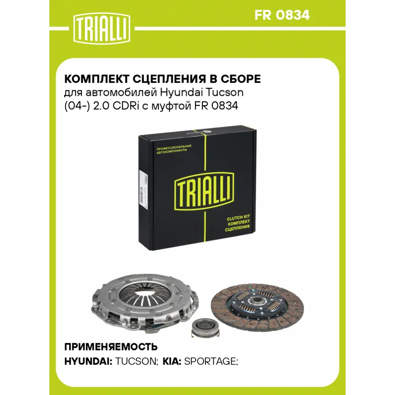Комплект сцепления в сборе для автомобилей Hyundai Tucson (04-) 2.0 CDRi с муфтой Характеристики: Артикул: FR 0834 OEM номера: 4110039300, 4130039295, 41421-39275 Профиль ступицы: 20 x 22.5 Число зубцов, шт.: 20 Диаметр, мм: 235 Гарантийный срок: 2 года/60 000 км Количество на автомобиль: 1 Товарная линейка: BLACK Комплектация: Диск сцепления ведомый - 1 шт Диск сцепления нажимной - 1 шт Муфта выключения сцепления в сборе - 1 шт Гарантия: от 1 года.