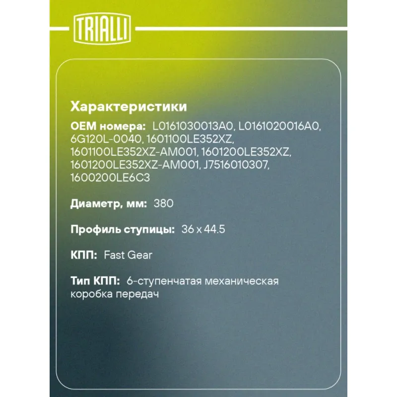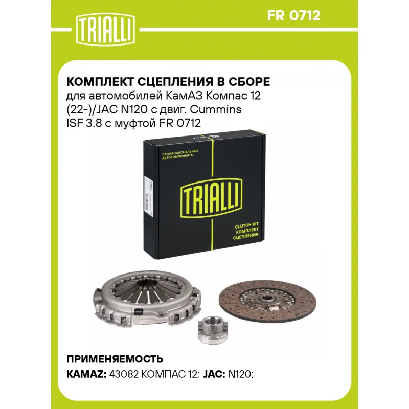 Комплект сцепления в сборе для автомобилей КамАЗ Компас 12 (22-)/JAC N120 с двиг. Cummins ISF 3.8 с муфтой Характеристики: Артикул: FR 0712 OEM номера: 1601100LE352XZ, 1601100LE352XZ-AM001, 1601200LE352XZ, 1601200LE352XZ-AM001, J7516010307 Гарантийный срок: 12 месяцев без ограничения по пробегу Количество на автомобиль: 1 Диаметр, мм: 380 Число зубцов, шт.: 10 Профиль ступицы: 36 x 44.5 Сопутствующий товар: Комплекты сцепления: FR 0711 Сопутствующий товар: Муфты сцепления: CT 0712 Тип двигателя: Cummins ISF 3.8 Макс. крутящий момент: 1200 Nm Тип КПП: Fast Gear, 6МТ Товарная линейка: BLACK Подходит для авто: КамаАЗ 43082 КОМПАС 12 JAC N120 Для проверки применяемости отправьте VIN автомобиля через вкладку "Есть вопросы о товаре?" Комплектация: Диск сцепления ведомый - 1 шт Диск сцепления нажимной - 1 шт Муфта выключения сцепления в сборе - 1 шт Гарантия: от 1 года.