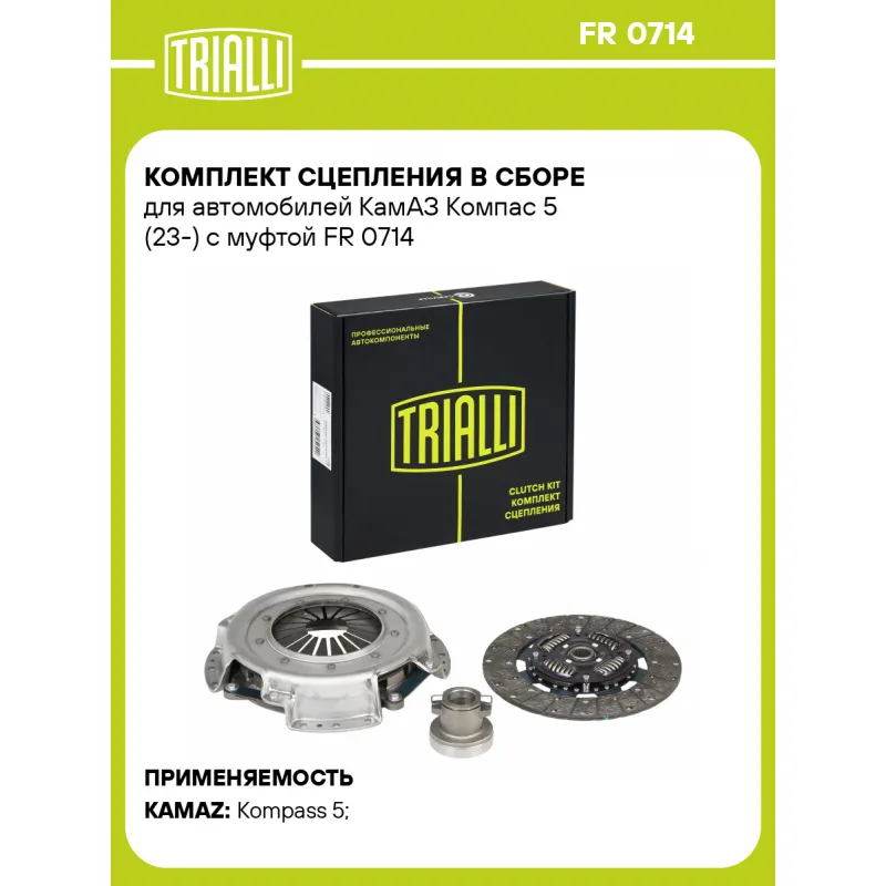Комплект сцепления в сборе для автомобилей КамАЗ Компас 5 (23-) с муфтой Характеристики: Артикул: FR 0714 OEM номера: 1600100E8Q28, 1600200E8Q28, R-1603555-00-00 Профиль ступицы: 23 x 25.6 Число зубцов, шт.: 24 Диаметр, мм: 275 Гарантийный срок: 2 года/60 000 км Количество на автомобиль: 1 Товарная линейка: BLACK Комплектация: Диск сцепления ведомый - 1 шт Диск сцепления нажимной - 1 шт Муфта выключения сцепления в сборе - 1 шт Гарантия: от 1 года.