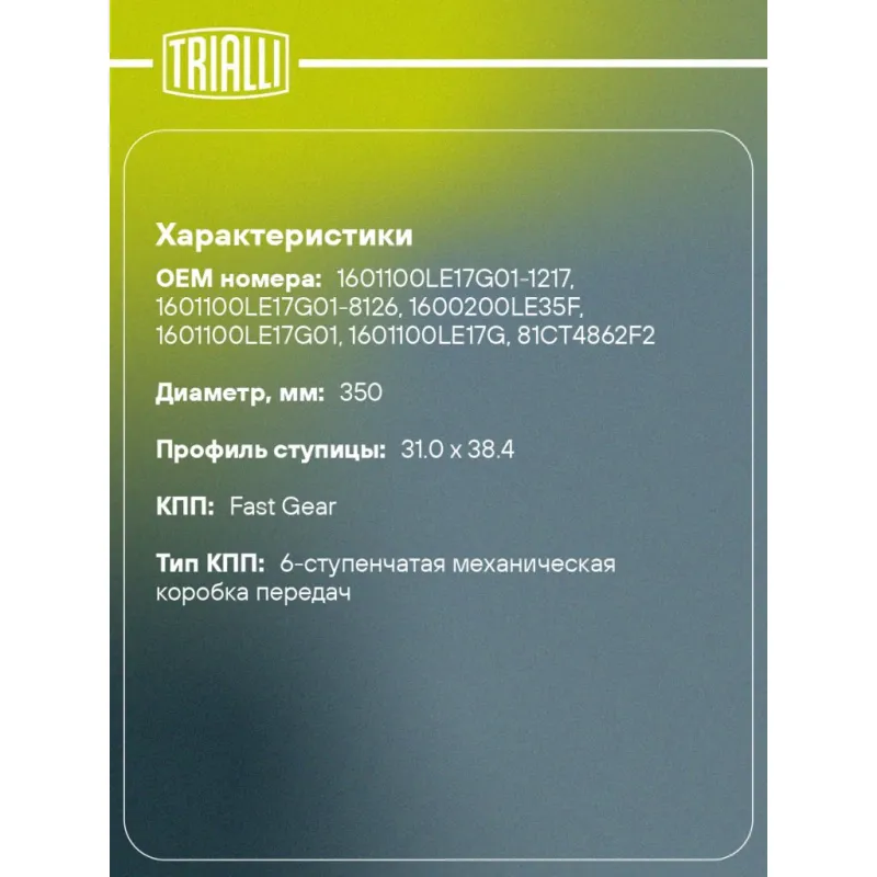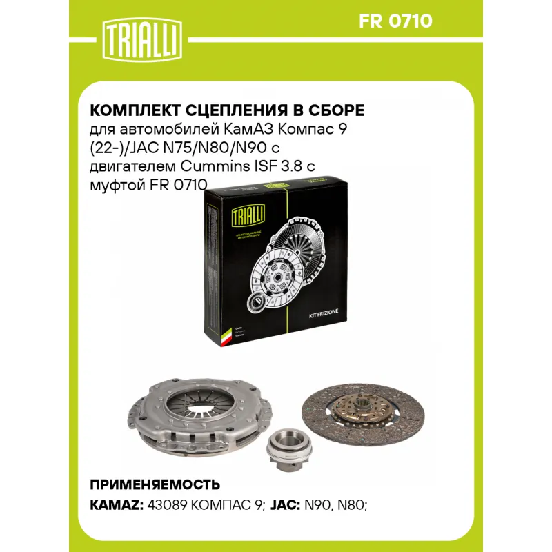 Комплект сцепления в сборе для автомобилей КамАЗ Компас 9 (22-)/JAC N75/N80/N90 с двигателем Cummins ISF 3.8 с муфтой Характеристики: Артикул: FR 0710 OEM номера: 1601100LE17G01-1217, 1601100LE17G01-8126, 1600200LE35F, 1601100LE17G01, 1601100LE17G, 81CT4862F2 Профиль ступицы: 31.0 x 38.4 Число зубцов, шт.: 10 Гарантийный срок: 12 месяцев без ограничения по пробегу Количество на автомобиль: 1 Диаметр, мм: 350 Сопутствующий товар: Муфты сцепления: CT 0711 Тип двигателя: Cummins ISF 3.8 Макс. крутящий момент: 780 Nm Тип КПП: Fast Gear, 6МТ Товарная линейка: BLACK Ширина зуба, мм: 5,9 Подходит для авто: КамаАЗ 43089 КОМПАС 9 JAC N90, N80 Для проверки применяемости отправьте VIN автомобиля через вкладку "Есть вопросы о товаре?" Комплектация: Диск сцепления ведомый - 1 шт Диск сцепления нажимной - 1 шт Муфта выключения сцепления в сборе - 1 шт Гарантия: от 1 года.
