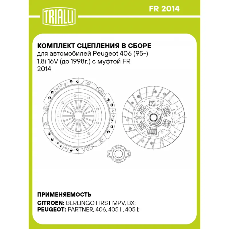 Комплект сцепления в сборе для автомобилей Peugeot 406 (95-) 1.8i 16V (до 1998г.) с муфтой FR 2014 TRIALLI