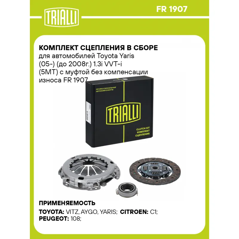 Комплект сцепления в сборе для автомобилей Toyota Yaris (05-) (до 2008г.) 1.3i VVT-i (5MT) с муфтой без компенсации износа Характеристики: Артикул: FR 1907 OEM номера: 312100D030, 312100D070, 312100D120, 31230-0H010, 31230-52040, 312500D090, 312500D091, 312500D161, 312500D162 Особенности конструкции:: Диск сцепления нажимной БЕЗ (!) компенсации износа Профиль ступицы: 18.9 x 22.5 Тип КПП: 5MT Гарантийный срок: 2 года/60 000 км Количество на автомобиль: 1 Диаметр, мм: 200 Число зубцов, шт.: 19 Товарная линейка: BLACK Комплектация: Диск сцепления ведомый - 1 шт Диск сцепления нажимной - 1 шт Муфта выключения сцепления в сборе - 1 шт Гарантия: от 1 года.